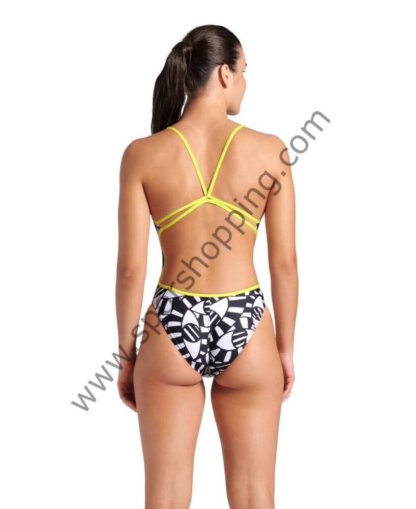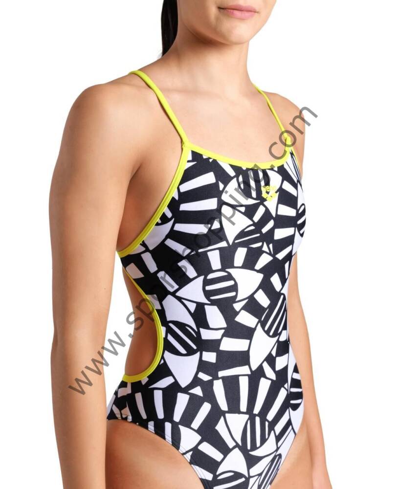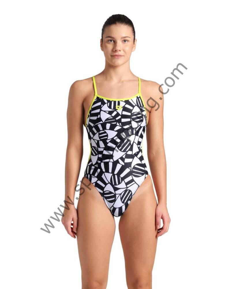 Siyah-beyaz geometrik göz desenleri ve neon sarı şerit detaylarıyla dikkat çeken bu özel tasarım mayo, hem stil sahibi hem performans odaklı kadın yüzücüler için üretildi. Cesur olmayı sevenlerin tercihi!